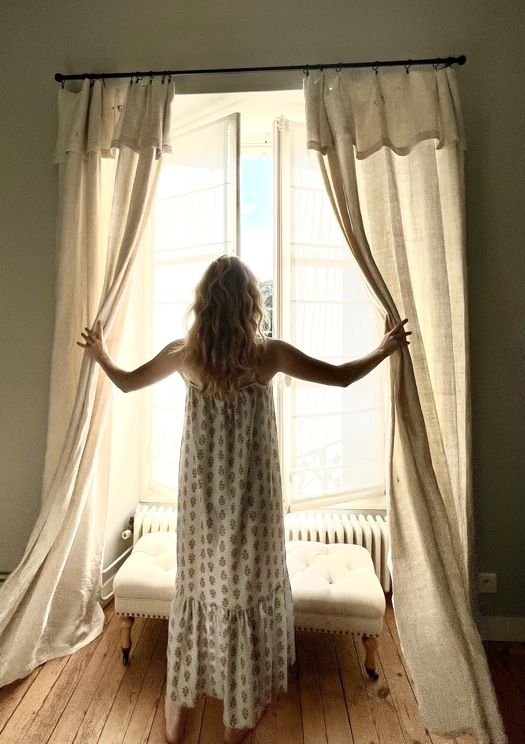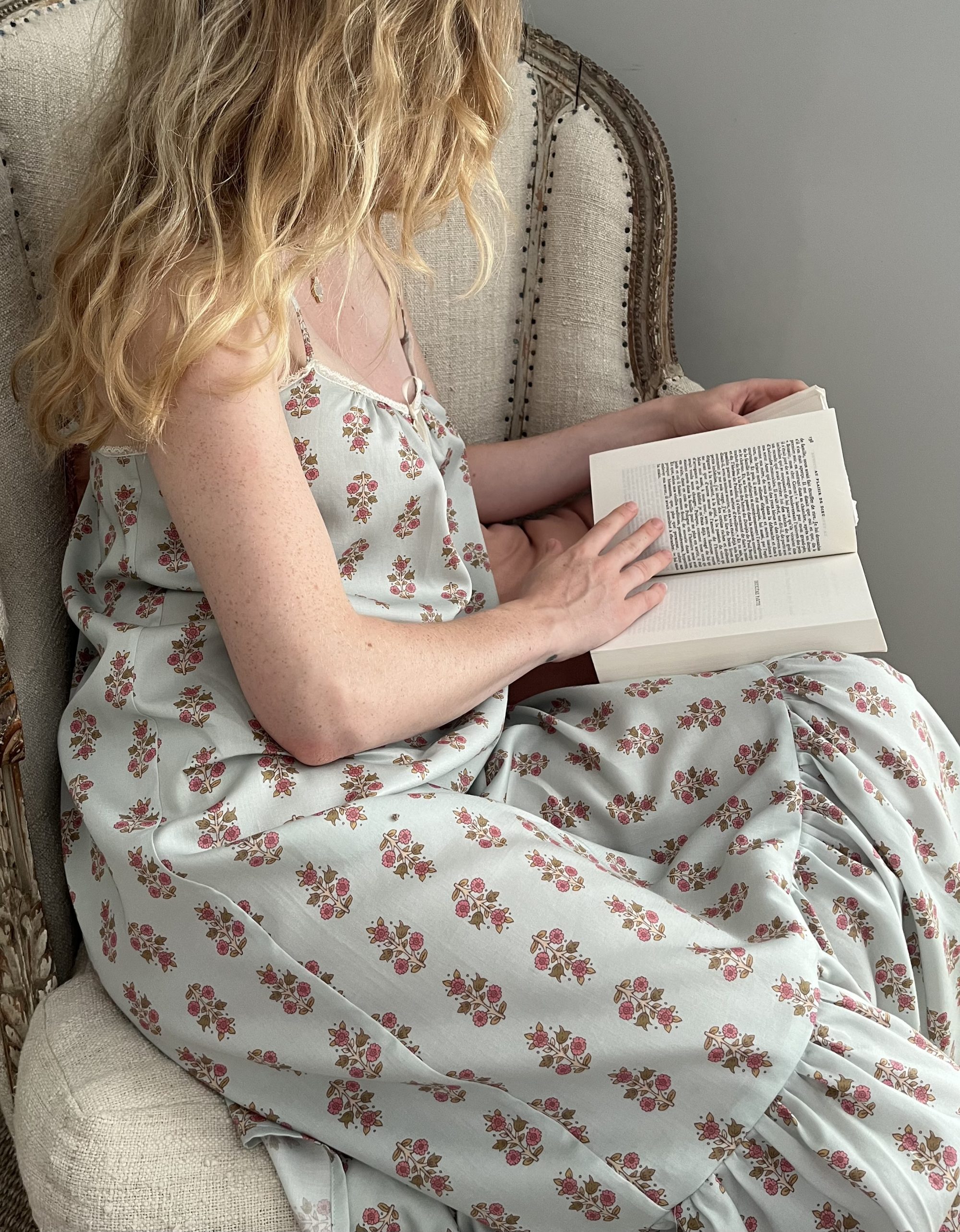 Ultra-feminine nightdress with lace at the neckline. Wide frill at the bottom and side slits along the length of the frill. This piece can be worn indoors as a nightdress/loungewear dress or outdoors as a summer dress. Designed in France, made in Portugal from cotton satin (100% cotton) printed with an exclusive Lalide à Paris pattern.