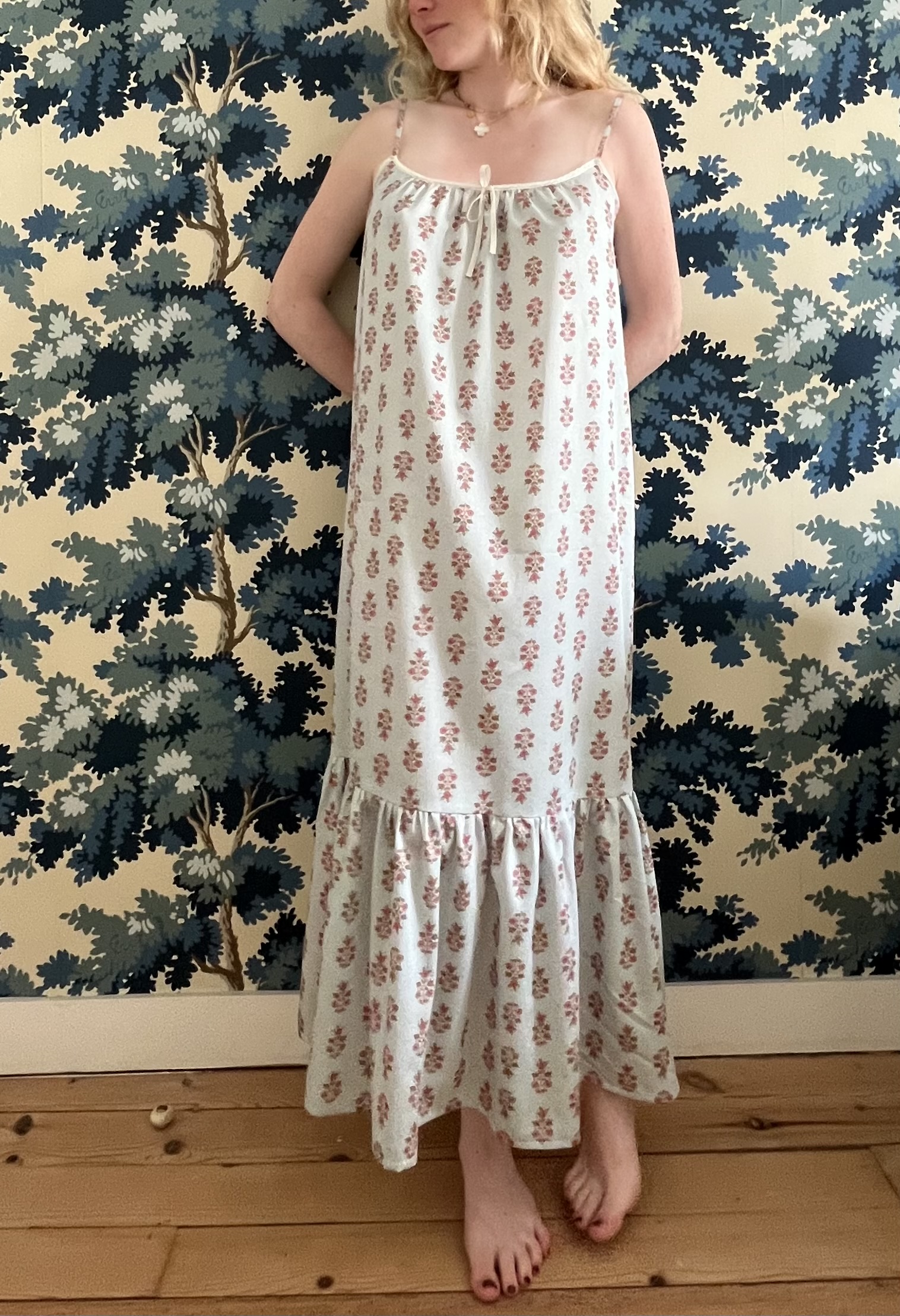 Ultra-feminine nightdress with a hand-drawn pattern featuring branches, leaves and flowers in pink and light khaki on a sky blue background. Lace at the neckline. Wide frill at the bottom and side slits at the height of the frill. Can be worn both indoors and outdoors. Same cut as Alia with a different print.