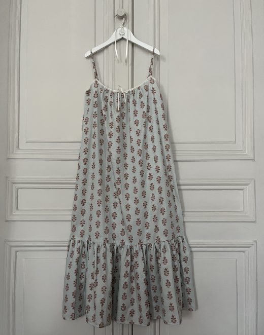 Lovely long kimono in blue and milky white striped cotton jersey. Tone-on-tone cotton lace along the shawl collar. Feminine, refined and ultra-soft. Coordinates with all styles in the collection.