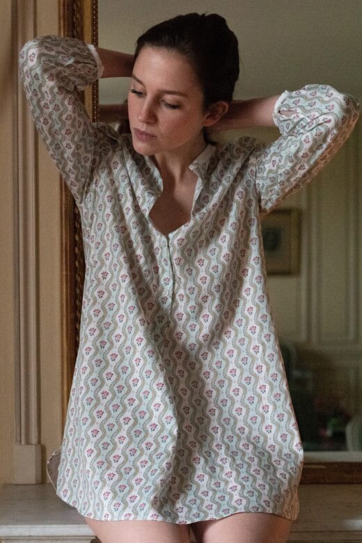 Liquette with a pretty “grand-père” collarin an old-fashioned pink stripe print. This little liquette-shaped nightgown is ideal for mornings with friends or family because it is very easy to wear and very feminine.