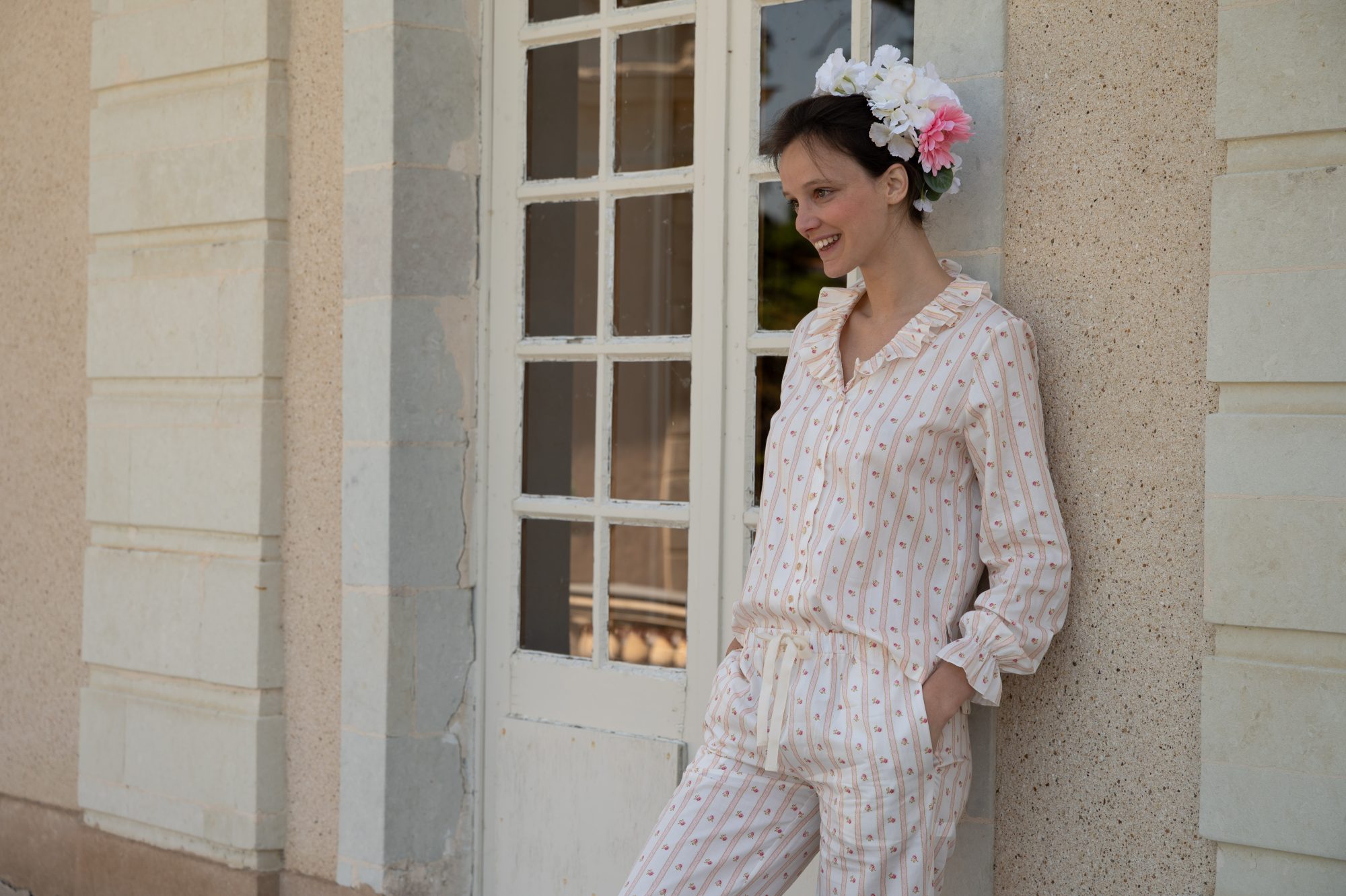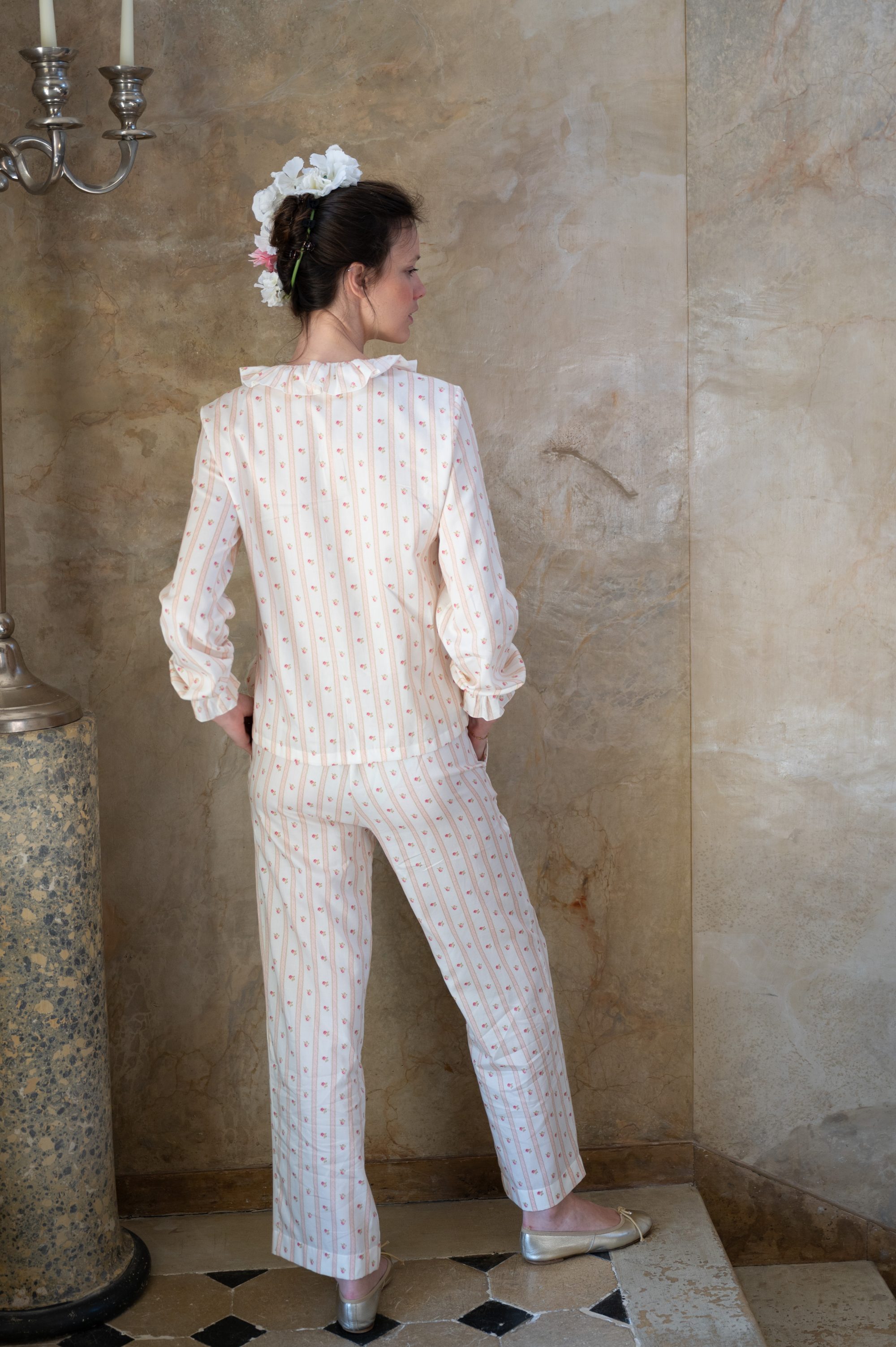 Pyjamas embellished with ruffles at the neckline and cuffs.