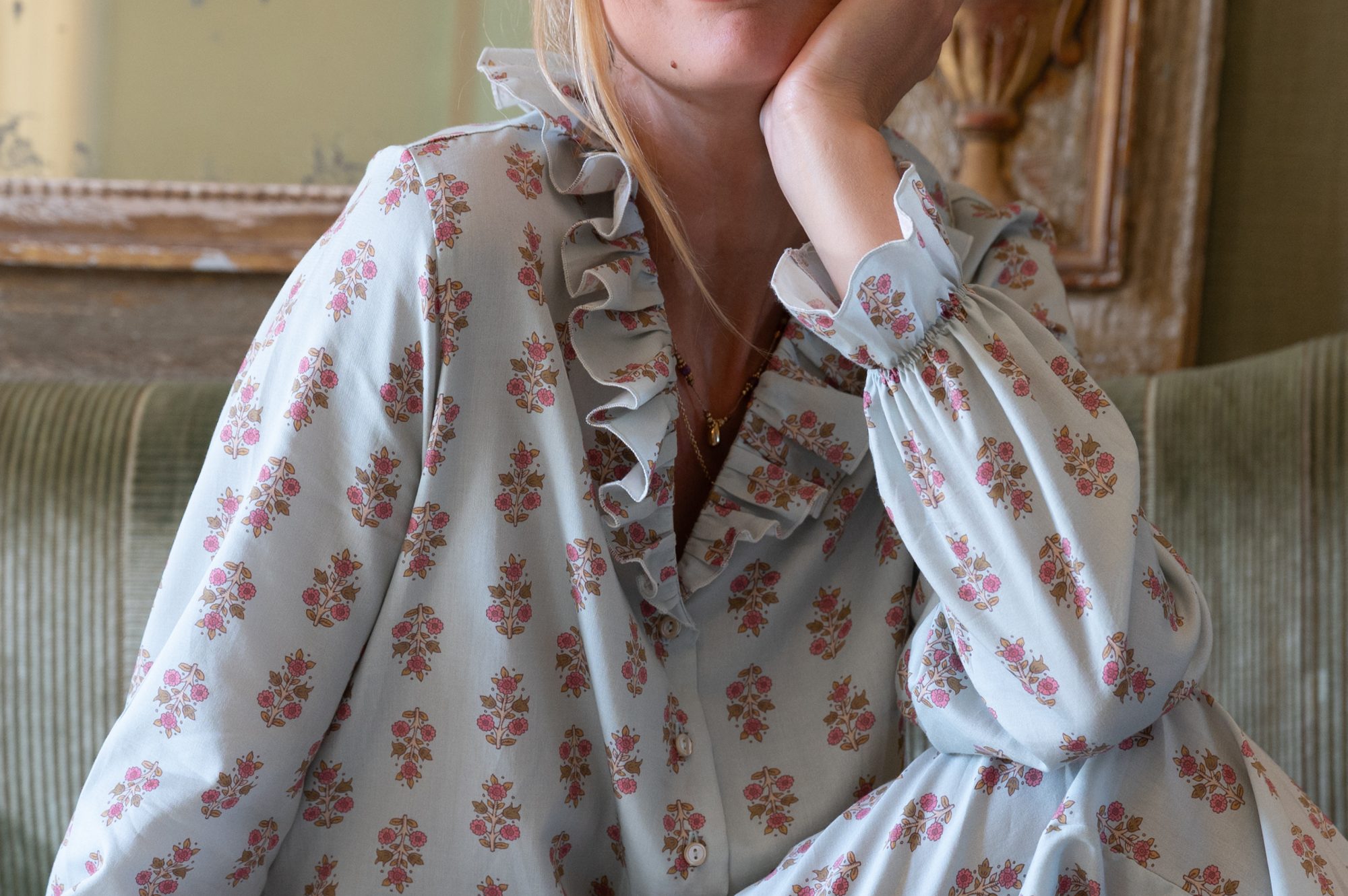 - Ruffles at neckline and cuffs.