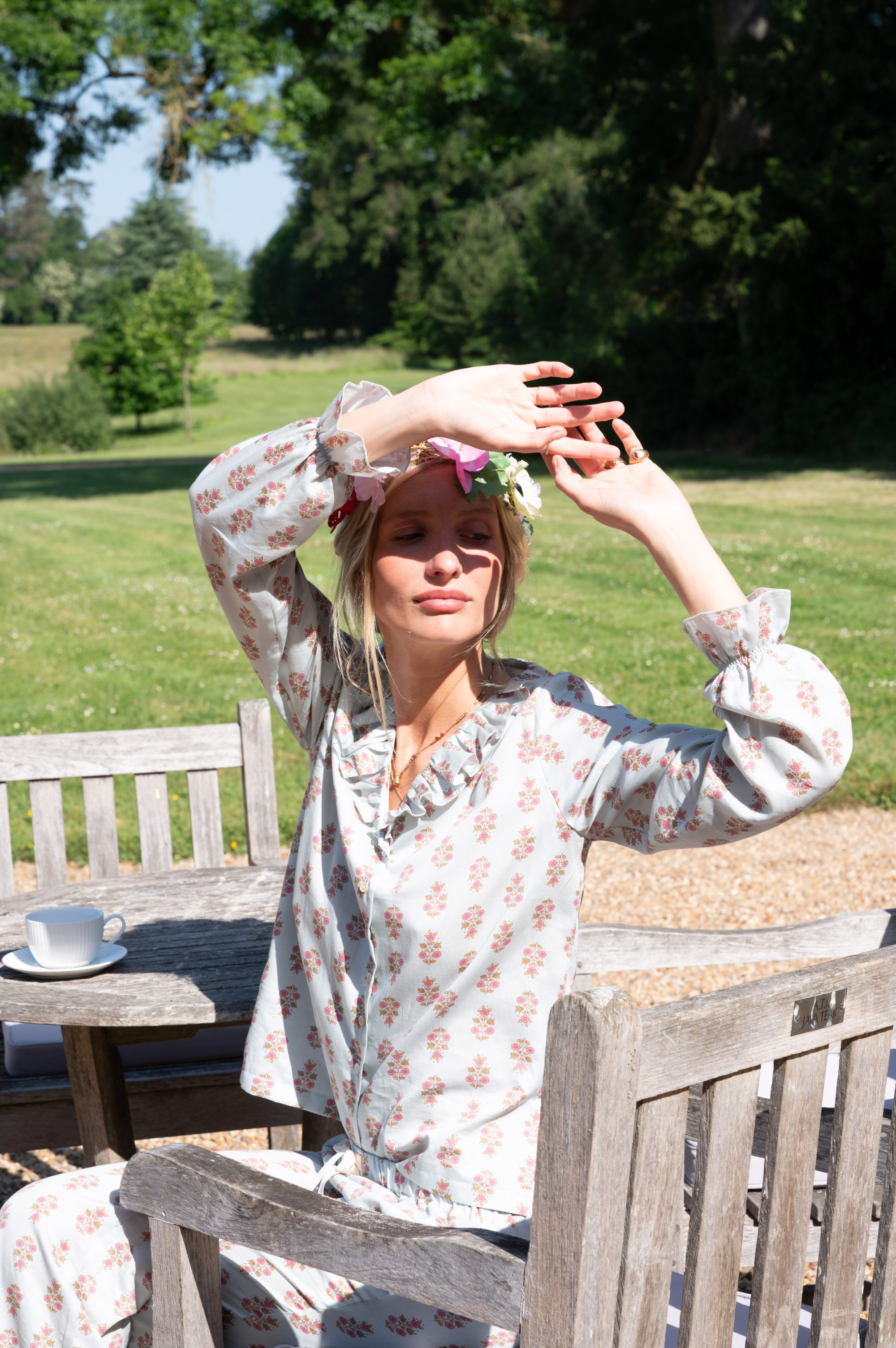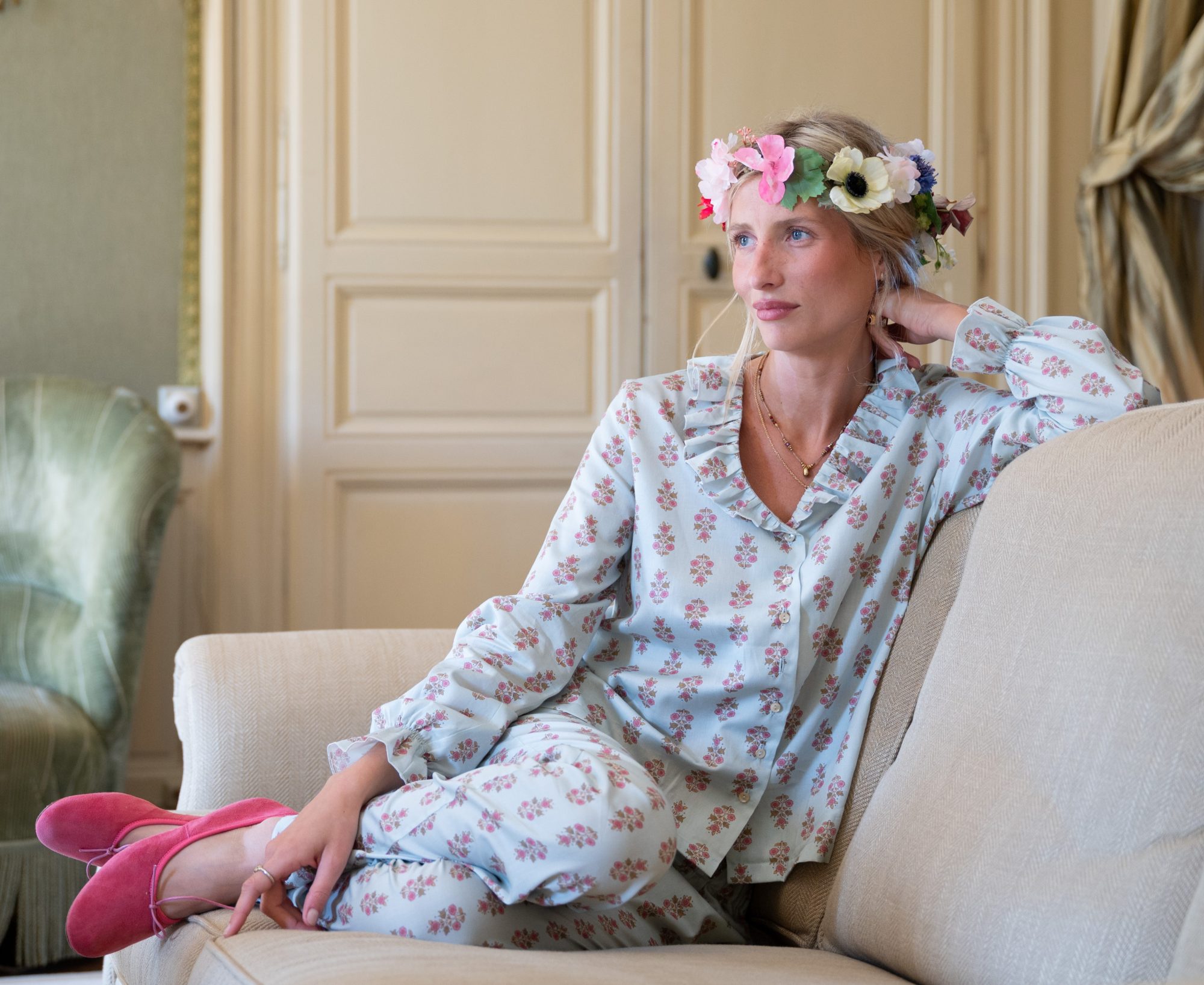 Pyjamas embellished with ruffles at the neckline and cuffs.