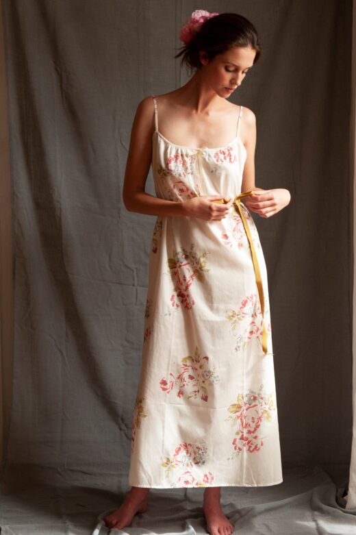 Nuisette longue en satin de coton français avec un imprimé floral ocre exclusif. Cette pièce peut à la fois être portée à l’intérieur comme nuisette / robe de détente ou à l’extérieur comme robe d’été. Conçu en France, produit au Portugal en satin de coton français (100% coton) imprimé d’un motif exclusif Lalide à Paris.