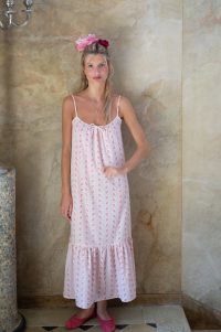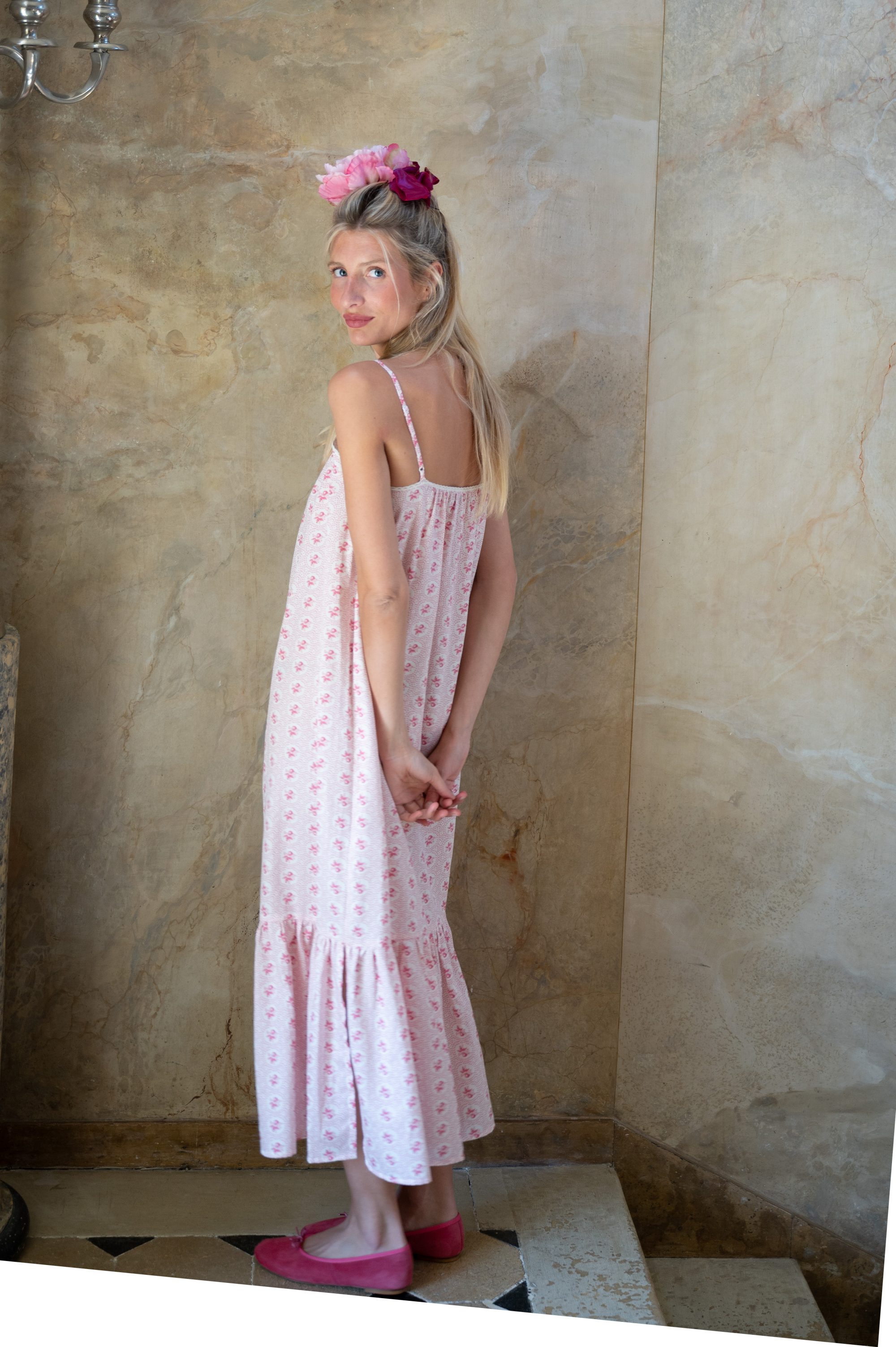 Nuisette ultra féminine, imprimée exclusif à motifs dessinés à la main représentant des boutons de roses dans médaillons sur fond de feuillage. Coloris rose moyen sur fond blanc lait. Dentelle à l’encolure. Large volant en bas, et fentes cotés sur la hauteur du volant. Se porte aussi bien à l’extérieur qu’à l’intérieur. Même coupe qu’Acanthe avec imprimé différent.
